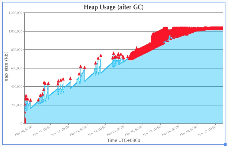 可以看到Full GC后的堆空间一直在持续增长(理想情况下,这个值应该是稳定的),到了Nov 19之后,一直在持续进行Full GC,却无法回收足够的堆空间,导致应用吞吐量急剧下降,CPU资源都在做GC操作。 内存无法被垃圾回收,显然存在内存泄露,内存泄露大致有两种情况: