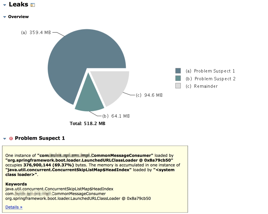 可以看到CommonMessageConsumer持有的ConcurrentSkipListMap占用了69.37%的堆空间。