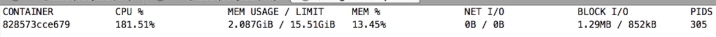 单次全量耗时4分30秒,docker容器显示的系统负载峰值(使用命令docker stats):