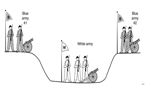 如图1所示,白军驻扎在沟渠里,蓝军则分散在沟渠两边。白军比任何一支蓝军都更为强大,但是蓝军若能同时合力进攻则能够打败白军。他们不能够远程的沟通,只能派遣通信兵穿过沟渠去通知对方蓝军协商进攻时间。是否存在一个能使蓝军必胜的通信协议,这就是两军问题。