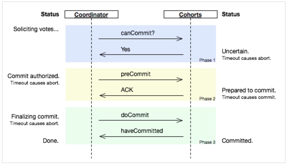 Three-Phase Commit,三阶段提交,分为CanCommit、PreCommit、do Commit三个阶段。