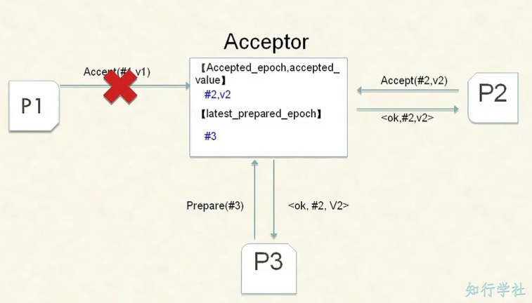 - acceptor会记录自己已经批准过的最大epoch值,如果一个acceptor收到一个编号为epoch的prepare请求,且epoch编号大于该值,它会将已经批准过的最大epoch值对应的提案作为响应返回,并承诺不在接收比当前epoch值更小的epoch请求。