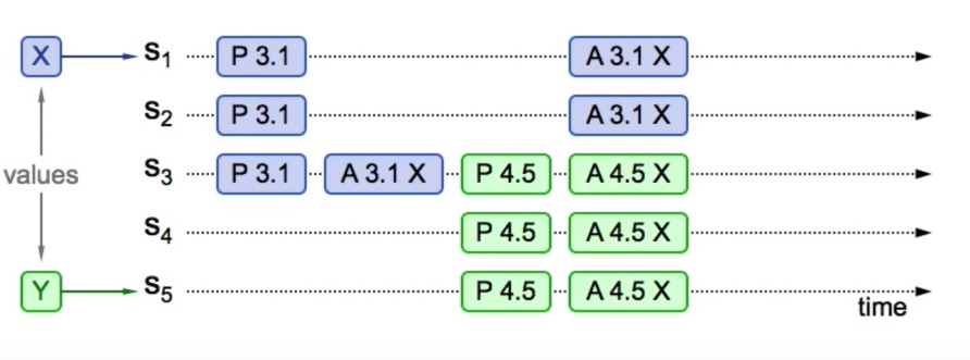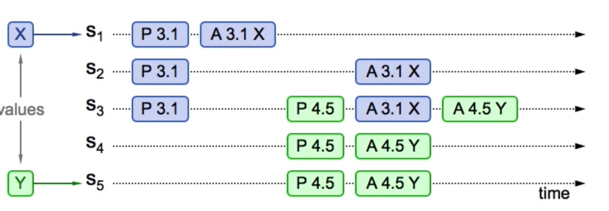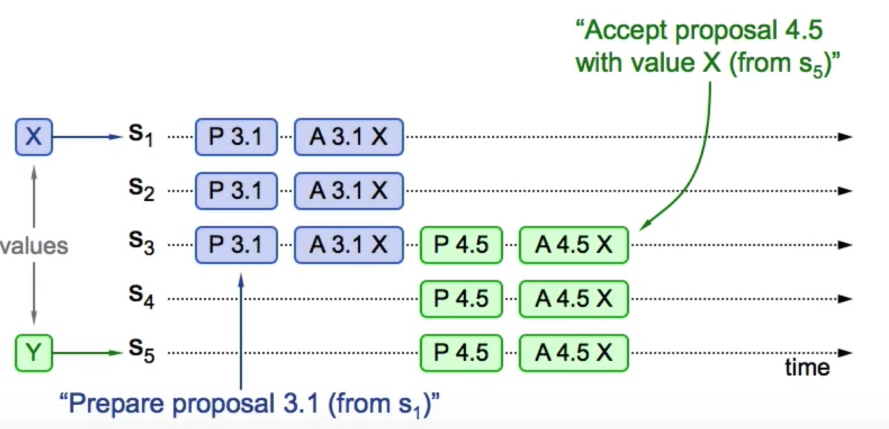 可以看到图中由Server 1 发起的epoch为3请求经过prepare(P 3.1)和accept(A 3.1 X)已经形成了确定性取值X,Server 5 发起的prepare请求通过Server 3看到了先前形成的取值X并予以认可,通过给Server3,Server4,Server5发送accept(A 4.5 X)成功使得X成为一致性取值。