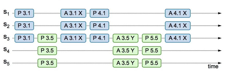 - Server1 发起epoch值为3的accept请求,S1,S2均返回OK,但是S3由于被Server 5发来的(P 3.5)抢占了访问权,返回fail,由于只收到2个OK(不超过半数),所以并未取得确定性取值