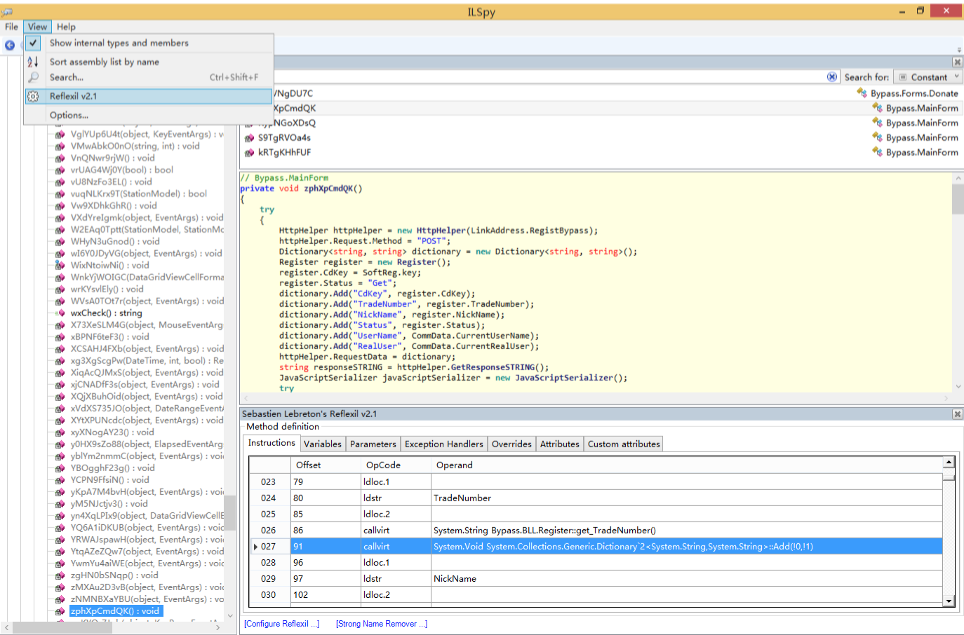 去了壳之后,可用的反编译软件就很多了,常用的就是ILSpy和Reflector,前者开源免费,后者付费,两者都可以搭配一个强力插件Reflexil使用。
