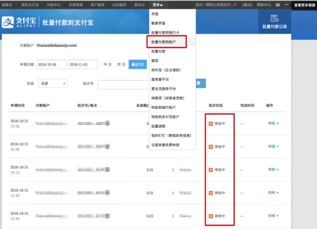 - 这个接口是有密的,表单提交之后需要在window+ie下输入密码才能完成付款操作,如果提交表单后未输入密码,这条付款记录会停留在待审核状态,没有超时或者关闭的回调,同一批次号无法重复提交,只能在支付宝网页端对已经提交的批次号进行审核处理: