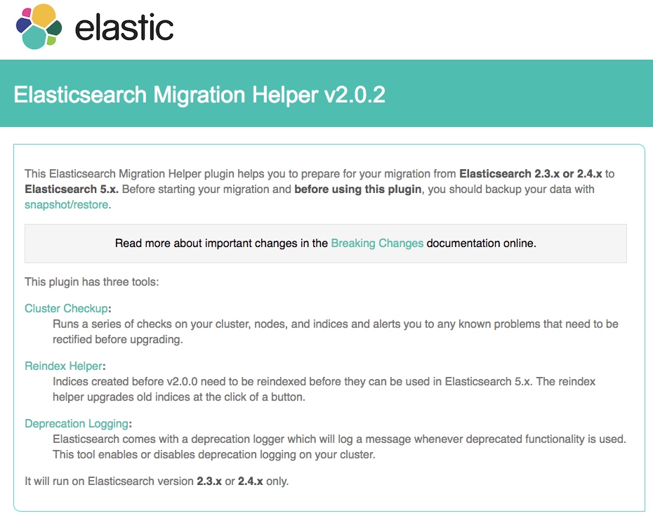 官方还非常周到的提供了一个迁移助手elasticsearch-migration,以插件的形式检测升级过程中需要注意的事项。