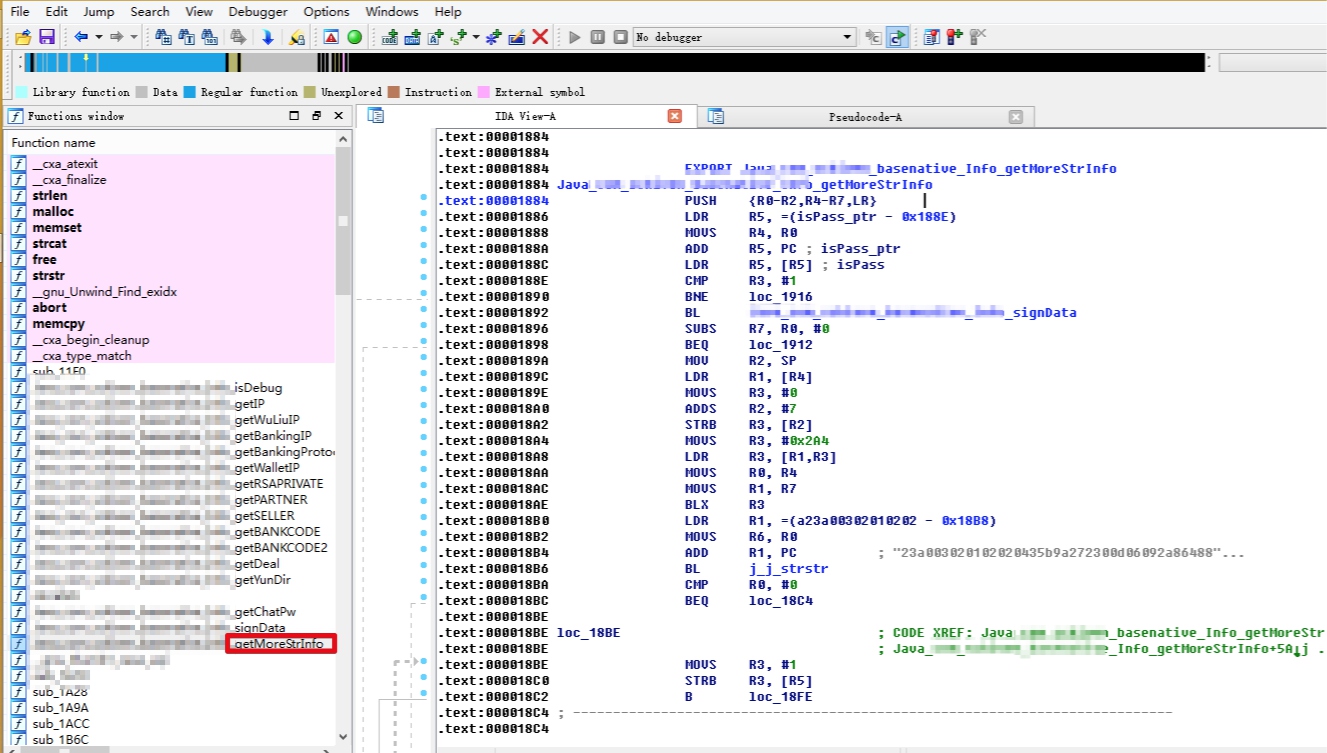 反编译发现这个方法是包裹在so中,也是常见的保护敏感信息的方式。