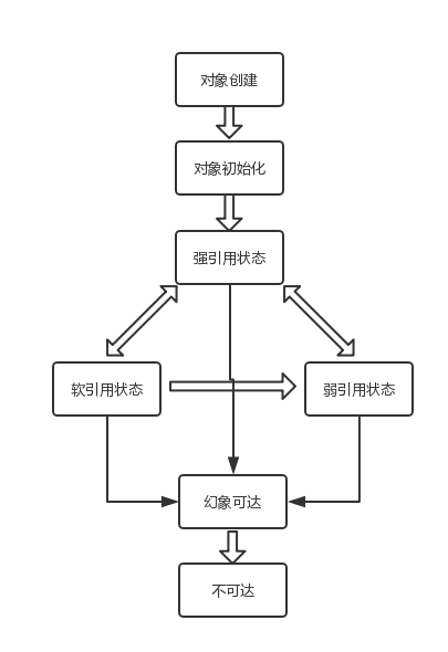 - 弱可达(Weakly Reachable),无法通过强引用或者软引用访问,只能通过弱引用访问时的状态。这是十分临近finalize状态的时机,当弱引用被清除的时候,就符合finalize的条件了。